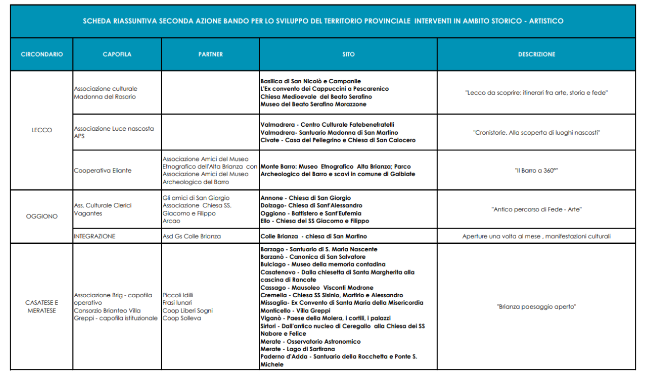 Il 20 giugno tutti i siti coinvolti dalla seconda azione di sistema del bando relativo al fondo “Sviluppo del territorio provinciale Lecchese – Interventi in ambito Storico-Artistico e Naturale”, proporranno “un’apertura straordinaria”. Si tratta di 54 siti di interesse artistico e storico che comprendono sia chiese che musei, lungo un’ideale dorsale che dalla Brianza si estende fino alle Valli ed al Lago, passando per i Piani dei Resinelli e lungo il Sentiero del Viandante.