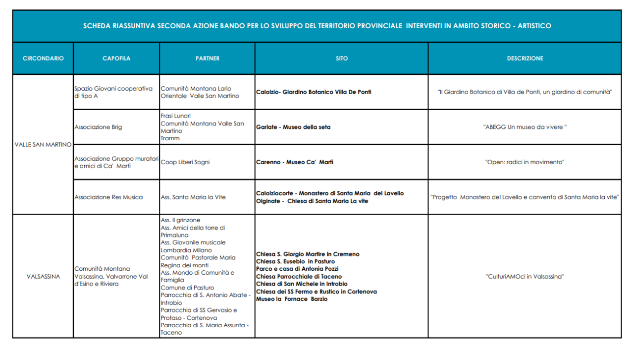 Ciascun sito e ciascun ente coinvolto ha ideato il progetto di valorizzazione tenendo conto di due obiettivi: da un lato aumentare la possibilità della fruizione del bene attraverso aperture straordinarie, progetti coordinati, laboratori ed eventi; dall’altro contribuire a disseminare esperienze formative e prelavorative per i giovani coinvolti. Si salda così un’alleanza tra cultura, sviluppo turistico, costruzione di comunità ed animazione territoriale. Si assiste nel territorio lecchese al diffondersi di un modello che prevede una micro progettazione diffusa, realizzata all’interno una cornice comune: in questo caso un bando, che funge da volano e moltiplica gli effetti delle singole azioni. A “certificare” l’unità di intenti dei siti coinvolti anche una “cartina”, da utilizzare come credenziale di viaggio. Un documento molto semplice, ma che consentirà ai visitatori di tenere traccia del proprio passaggio nei luoghi indicati e di avere una panoramica unitaria rispetto al progetto.