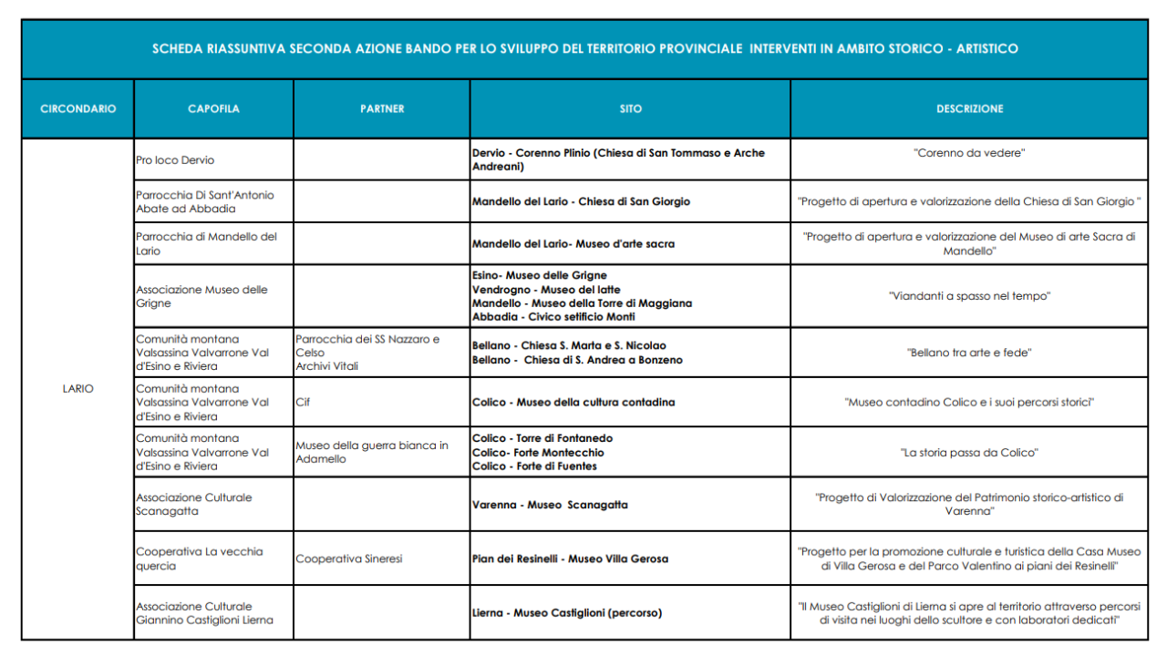 A redigere i progetti 44 enti del terzo settore, parrocchie e associazioni che singolarmente o in forma associata hanno partecipato al bando. I progetti sono stati finanziati con un contributo di 462 mila euro per l’annualità incorso. Il fondo “Sviluppo del territorio provinciale Lecchese – Interventi in ambito Storico-Artistico e Naturale” ha un respiro ampio ed una prospettiva di lunga durata: siglato per volontà dei Comuni Soci di Lario Reti Holding con la Fondazione Comunitaria del Lecchese a fine 2019, ha un orizzonte quinquennale ed una consistente dotazione di 2.500.000 euro. “Apriamoci alla bellezza” è quindi un’iniziativa di sistema, che vuole sottolineare la matrice comune che ha ispirato in numerosi progetti di animazione territoriale e promozione della fruizione della cultura.