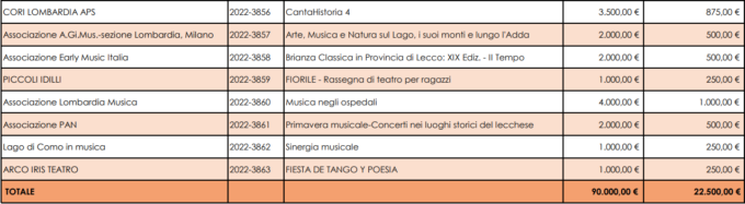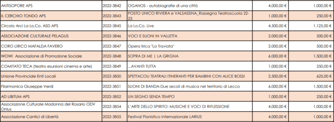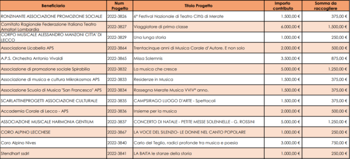 “L’elevata partecipazione anche in occasione di questo secondo Bando 2022 evidenzia come il Fondo che abbiamo costituito stia operando in modo coerente rispetto agli obiettivi che ci eravamo dati, ovvero agendo da concreto supporto per il settore degli spettacoli dal vivo promossi in provincia di Lecco sia da realtà consolidate, sia da nuove esperienze organizzate, agendo quindi da stimolo per la creatività e l’intraprendenza in ambito culturale” ha sottolineato Maria Grazia Nasazzi (, presidente della Fondazione comunitaria del Lecchese.