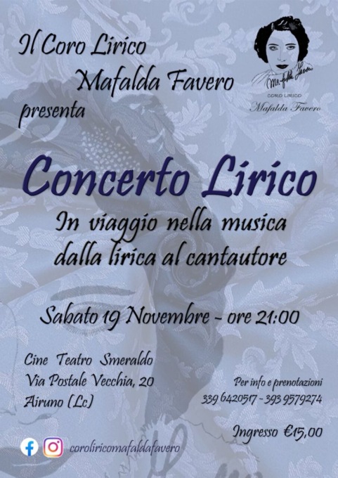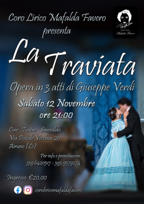 Il Coro Lirico Mafalda Favero organizza due appuntamenti musicali di grande valore, sempre alle 21 presso al cinema Smeraldo di Airuno in via Postale Vecchia 20: sabato 12 novembre verrà proposta la versione completa de “La Traviata”, opera in 3 atti di Giuseppe Verdi, mentre sabato 19 novembre sarà la volta di un concerto lirico dal titolo “In viaggio nella musica dalla lirica al cantautore” con l’esecuzioni di brani famosi della musica italiana. In entrambi gli appuntamenti come solisti si esibiranno cantanti del coro della Scala di Milano.
