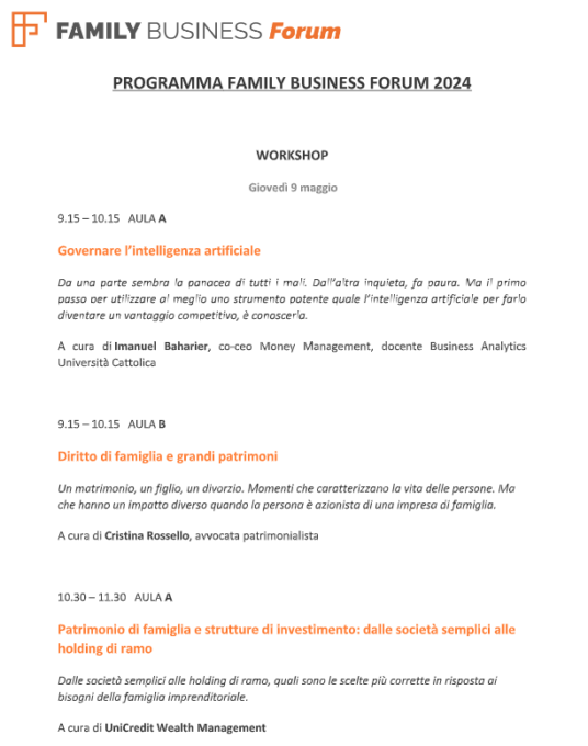 La partecipazione l Forum – in presenza o in streaming – è gratuita, con iscrizione obbligatoria sul sito www.familybusinessforum.net.