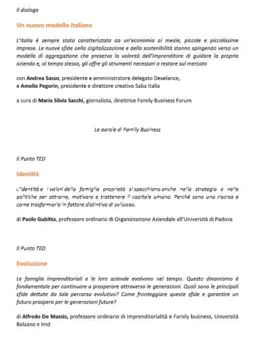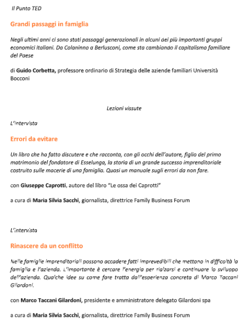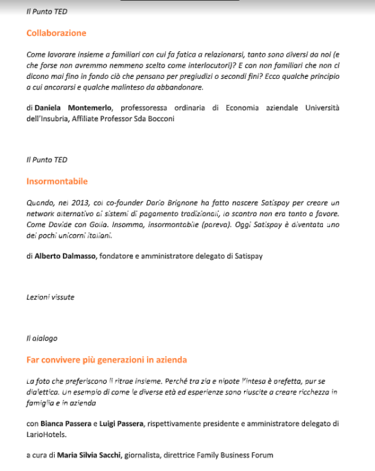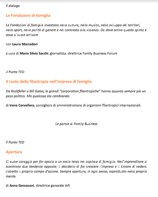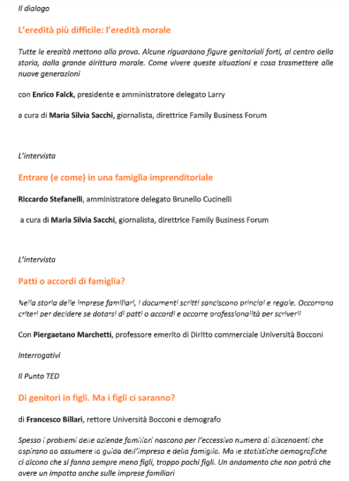 “L’edizione di quest’anno è particolarmente importante perché arriva in un momento di cambiamento in alcuni tra i principali gruppi imprenditoriali del Paese – ha sottolineato Maria Silvia Sacchi, ideatrice e direttrice del Forum -. Successioni che, a dispetto di quello che siamo portati a pensare, si sono svolte nella gran parte in armonia e in una continuità di valori. Siamo di fronte a un nuovo capitalismo familiare, più aperto, più internazionale, con imprenditori determinati a crescere e a fare la propria parte nella società come dimostra, per esempio, l’attività attraverso le Fondazioni di famiglia. Il Forum vuole essere un luogo dove condividere le pratiche migliori, e anche ciò che non va bene, con l’obiettivo di contribuire a migliorarci tutti”.