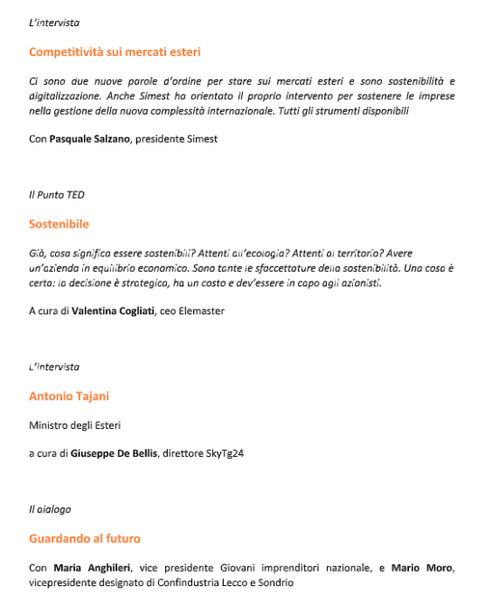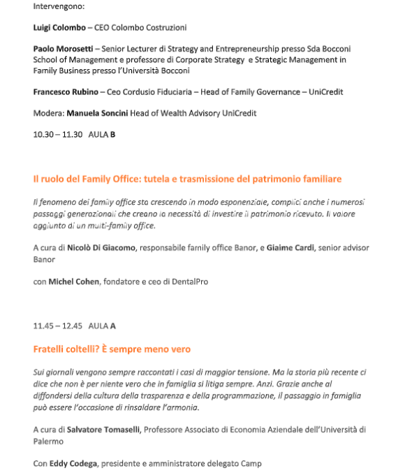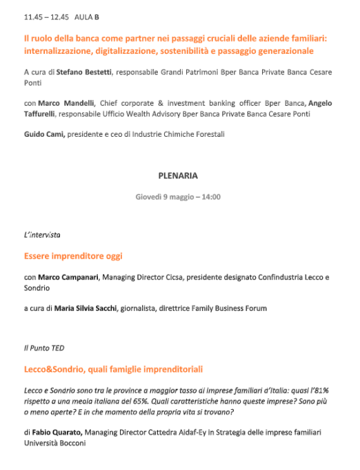 “Per il nostro territorio, ricco di realtà imprenditoriali che mantengono una identità famigliare, è particolarmente interessante l’occasione di ospitare un evento interamente focalizzato sui temi che le riguardano da vicino, toccando molte sfaccettature – ha chiosato Marco Campanari, Presidente Designato di Confindustria Lecco e Sondrio. – Il programma articolato, il prestigio degli ospiti, il format vivace sono la premessa per giornate cariche di spunti dove anche il nostro sistema produttivo sarà protagonista, con alcune delle sue voci, e dove noi tutti avremo occasione per confrontarci con questioni rilevanti in un tempo carico di cambiamenti e sfide quotidiane”
