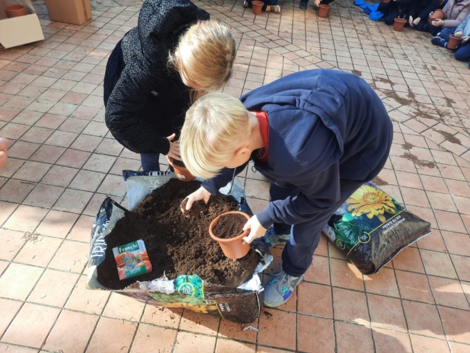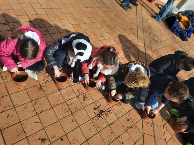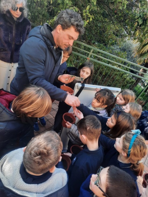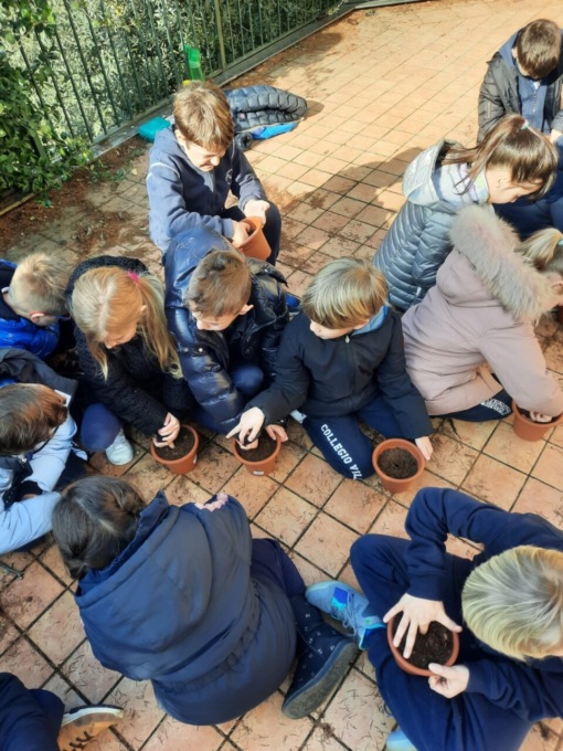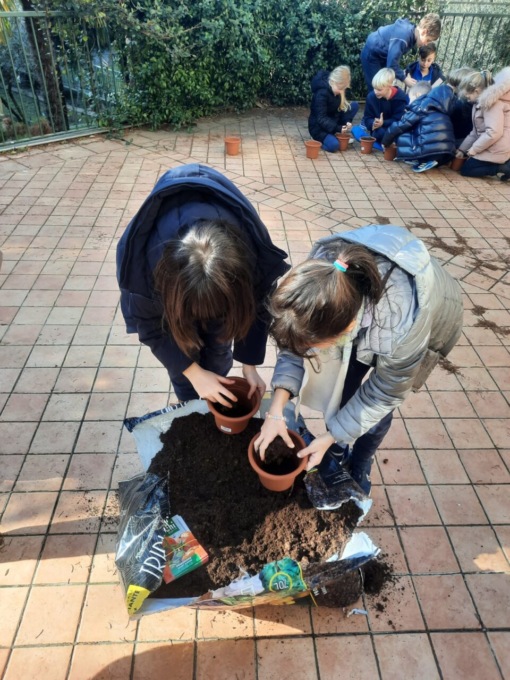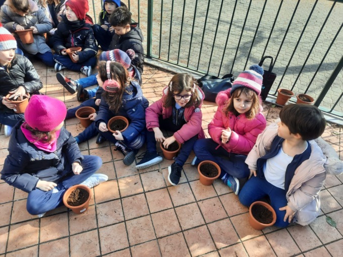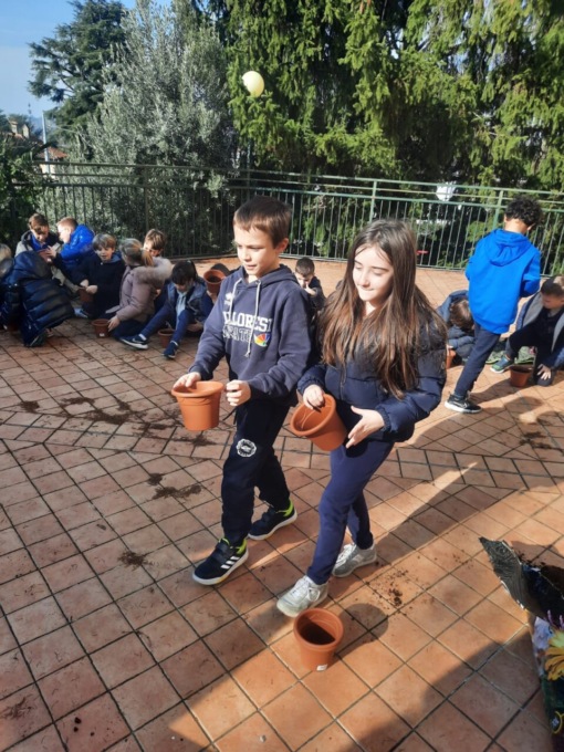 Terminate le presentazioni e gli approfondimenti in aula, frequentemente interrotti dall’entusiasmo e dalla curiosità dei bambini che intervenivano con numerose domande, il teatro delle attività si è spostato all’aperto, nel cortile dell’istituto, dove era già stato predisposto tutto il materiale necessario per la semina: i sacchi di terriccio, forniti dal vivaio Ikebana di Missaglia; i vasetti, offerti dall’azienda Plastecnic con sede a La Valletta Brianza; le sementi, «griffate» Franchi Sementi Spa.