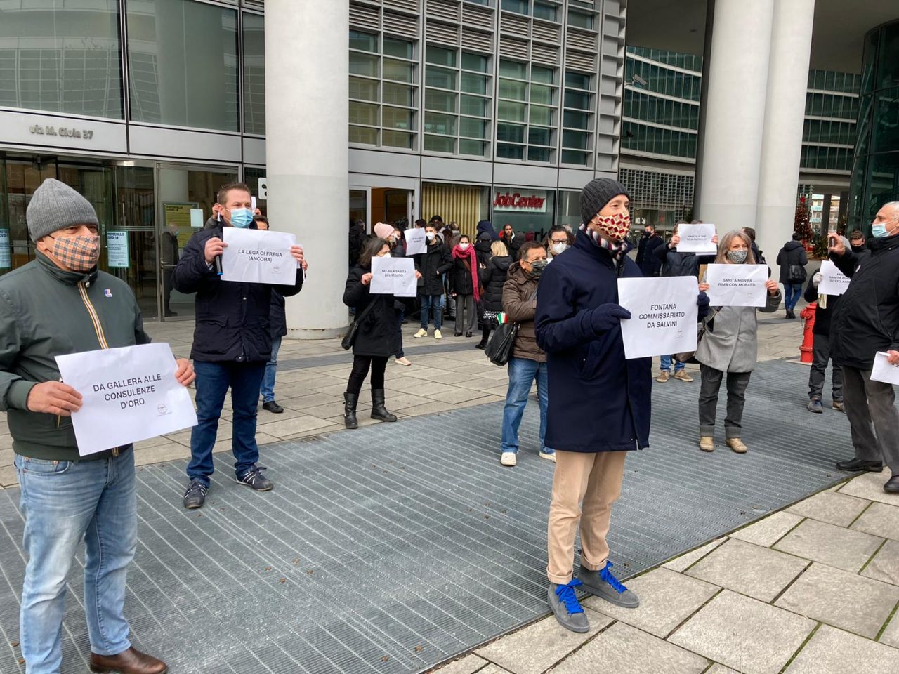 Flash mob del Movimento 5 Stelle questa mattina, sabato 9 gennaio 2021, sotto il Pirellone. Ordinato e pacifico, nel rispetto delle regole sul distanziamento sociale, è cominciato alle 10.30 in piazza Città di Lombardia per manifestare contro la nuova Giunta del governatore Fontana a fronte delle criticità vissute durante l’emergenza sanitaria.