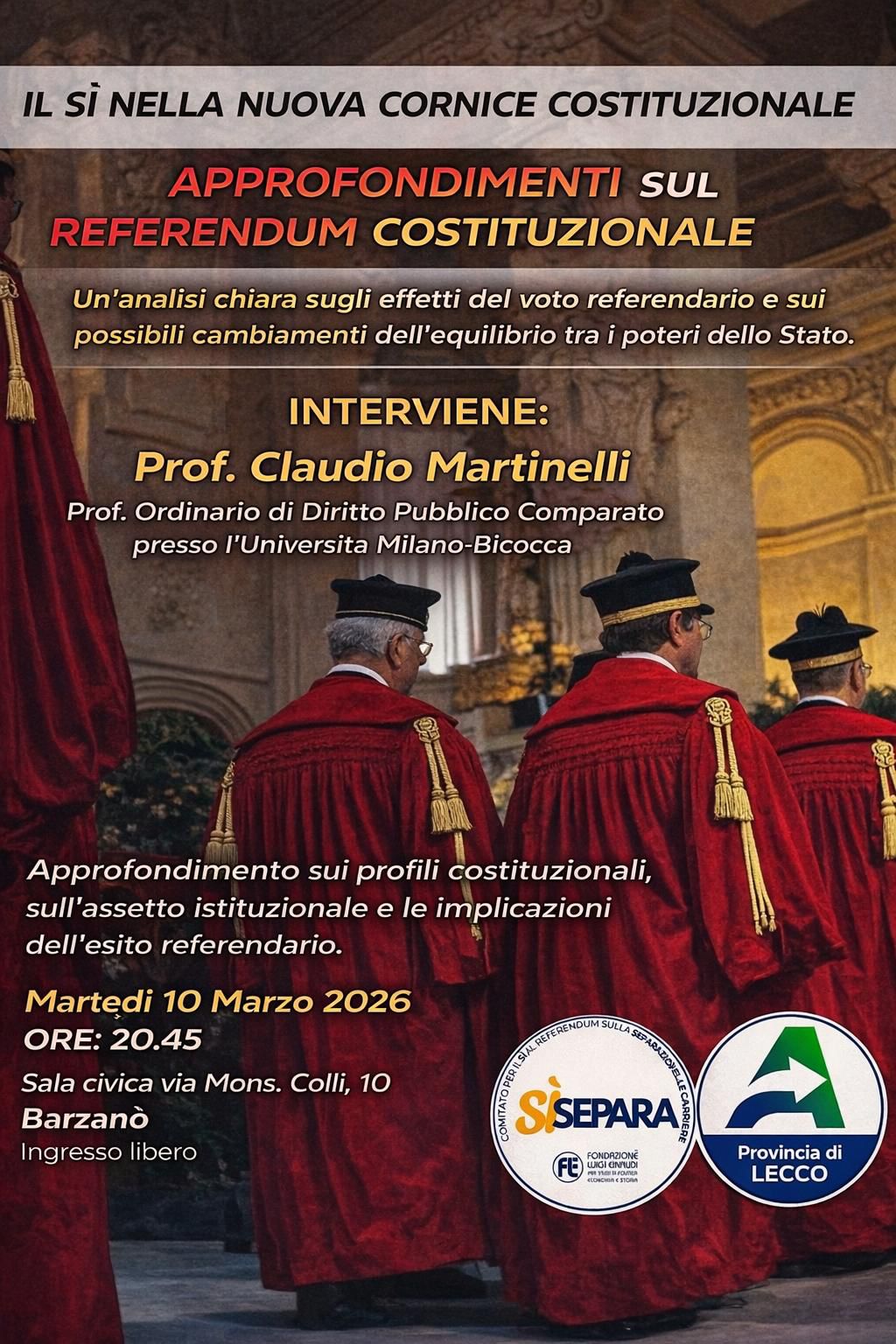 Ospite della serata sarà il professor Claudio Martinelli, Professore Ordinario di Diritto Pubblico Comparato presso l’Università degli Studi di Milano-Bicocca, figura autorevole che potrà fornire un’analisi tecnica e indipendente sui contenuti del referendum e sulle sue possibili conseguenze.