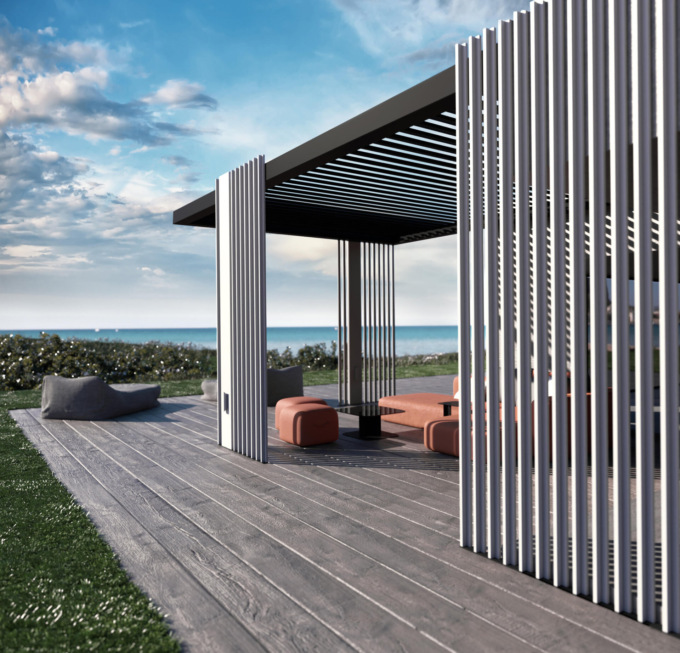 Concepita per essere plasmata alla perfezione rispetto allo scenario in cui si contestualizza il progetto e modulata a seconda delle peculiarità di fruizione delle persone che la utilizzeranno, CODE diventa un nuovo ambiente da vivere tutto l’anno, in ogni momento della giornata. Tramite un sistema di illuminazione Led indiretta e la scelta delle finiture colore personalizzate è così possibile creare scenari outdoor in perfetta continuità con l’abitazione. La personalizzazione della struttura trova la sua massima espressione nella composizione customizzata di screen laterali in alluminio, che possono essere completamente chiusi da pareti a tutto vetro scorrevoli, sormontati da una pergola bioclimatica o pergola con telo in pvc retraibile. L’alluminio utilizzato nelle doghe è un materiale perfetto per resistere alle intemperie e allo stesso tempo sostenibile in quanto può essere riutilizzato all’infinito per dare vita ogni volta a nuovi prodotti. Le luci, sia come faretti che come strisce perimetrali, danno la possibilità di godere dell’outdoor living, anche nelle ore buie, creando un’atmosfera straordinaria.