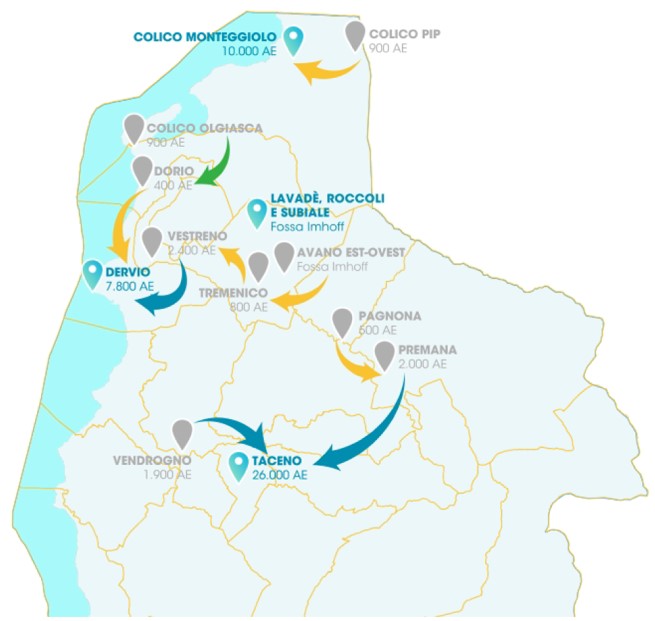 Gli interventi proposti per l’Alto Lago mirano alla riorganizzazione del servizio, portando alla dismissione di numerosi impianti di dimensioni ridotte con collettamento verso gli impianti più importanti per un totale di 9 Impianti dismessi. Tra gli interventi delineati – e alcuni già realizzati nello scorso biennio – troviamo il potenziamento di Colico Monteggiolo e anche di Dervio, con il collettamento dell’impianto di Pagnona verso Premana; per Colico verranno realizzati il collettamento di Colico PIP verso Monteggiolo, mentre l’impianto Colico Olgiasca verrà collettato verso Dorio.
