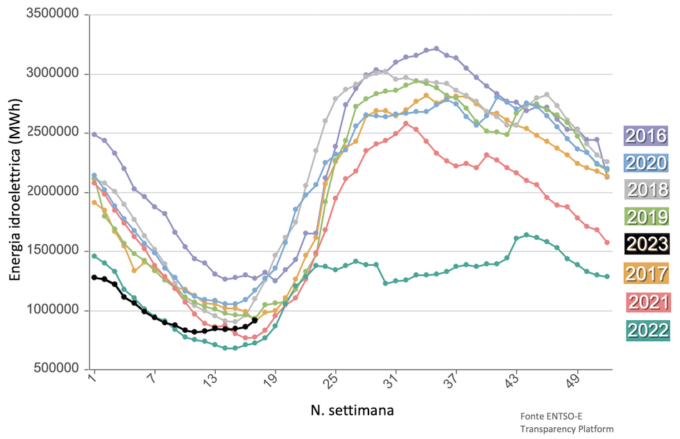 Il dato apparentemente più positivo presente nel bollettino dell’Osservatorio Siccità riguarda la produzione di energia idroelettrica che nel mese di aprile è stata maggiore sia rispetto all’aprile del 2022 che a quello del 2021. Questo aumento però è dovuto alle alte temperature registrate sulle Alpi che hanno fatto fondere una buona percentuale della neve accumulatasi nei mesi invernali.