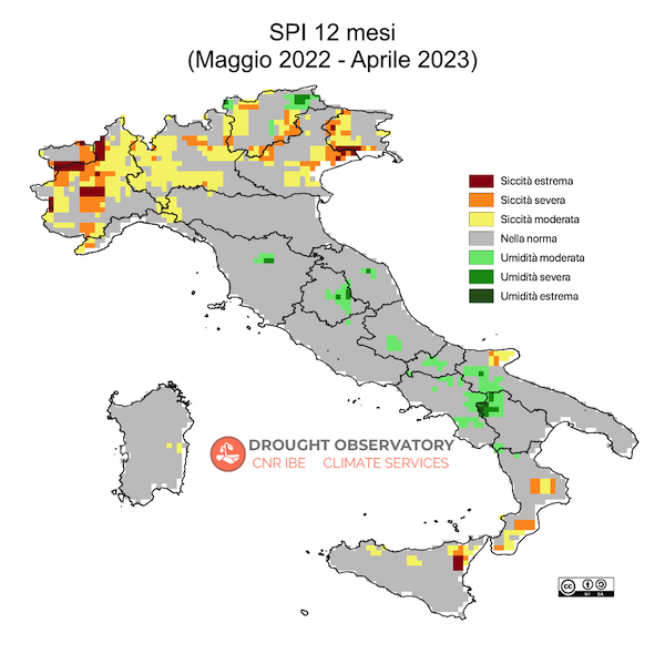 Se invece si confronta la stessa mappa con una che mostra lo SPI calcolato tra il maggio del 2022 e l’aprile 2023 è evidente come la siccità non sia finita: in Piemonte, Valle d’Aosta e Friuli-Venezia Giulia ci sono zone in condizioni di siccità estrema a causa della scarsità di precipitazioni; i territori indicati in giallo, arancione e ancor di più rosso continuano a mostrare gli effetti della carenza d’acqua che dura da più di un anno.