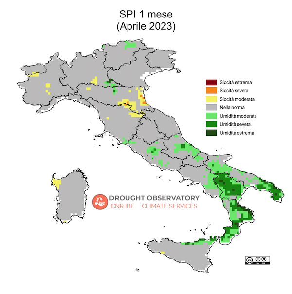La mappa riportante lo SPI di aprile 2023 mostra condizioni di siccità moderata e in poche zone quali ii Piemonte, le coste della Romagna e i vicini Appennini.
