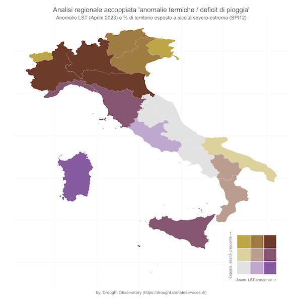 Osservando invece un’altra mappa del rapporto, che mette insieme i valori sulle precipitazioni a quelli sulle temperature, si evince che le regioni che più hanno subìto l’effetto combinato di carenza di piogge e temperature maggiori della media sono Piemonte, Lombardia ed Emilia-Romagna: le alte temperature aumentano l’evaporazione dal suolo e la traspirazione delle piante, aggravando la carenza d’acqua.