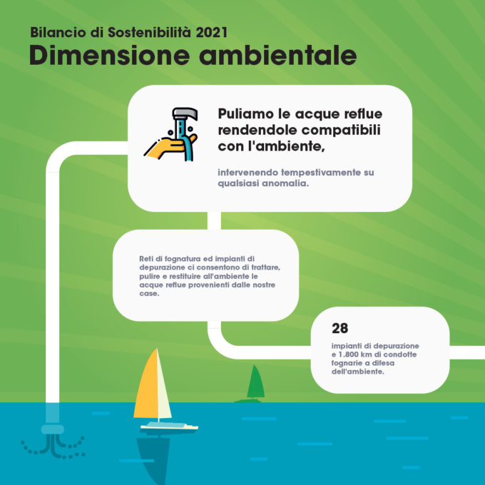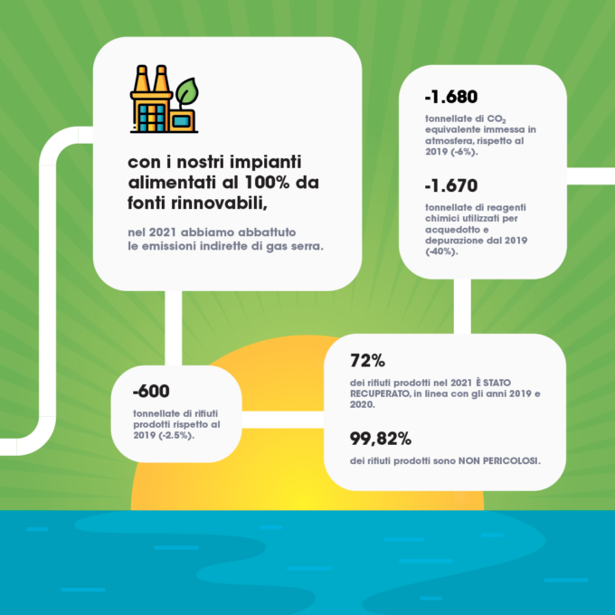 All’interno di questo macro-capitolo, oltre alle attività volte a ridurre gli impatti aziendali a livello ambientale – che includono depurazione delle acque reflue, raccolta delle acque dalla fognatura e il trattamento necessario a renderle compatibili con l’ambiente, riduzione dei consumi energetici e delle emissioni di CO, verifica e controllo degli scarichi industriali e degli impianti ed interventi per la gestione delle perdite – sono stati introdotti alcuni ambiti ed interventi nuovi e rilevanti, non presenti nella edizione precedente del report di Sostenibilità.
