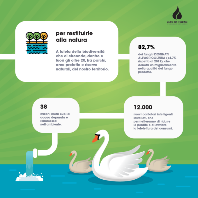 Inoltre, nel capitolo della biodiversità, sono stati inseriti tre avvenimenti del 2021 che rappresentano l’attenzione di Lario Reti Holding nei confronti della flora e della fauna, intesi come valore imprescindibile che è necessario preservare. Tra questi vi è il Progetto di risanamento del Lago di Annone, fondamentale per far fronte al  progressivo deterioramento della qualità delle acque e per risalire alle cause del dilavamento superficiale; la sospensione dei lavori di posa del collettore fognario da Civenna a Valmadrera nel periodo da marzo a giugno 2021, in quanto la località Melgone è il più importante sito della provincia di Lecco, e tra i più importanti a livello regionale, per la riproduzione del rospo Bufo Bufo, e la sospensione tra maggio e ottobre del 2021 delle operazioni di posa della tratta sublacuale relativa ai lavori di raddoppio dell’Acquedotto Intercomunale Brianteo per rispettare il ciclo naturale di flora e fauna del Lago di Annone.
