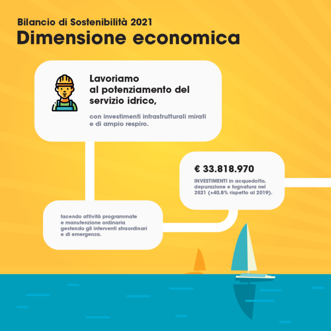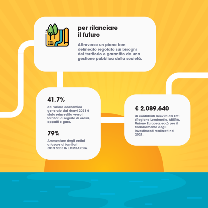 L’ultima dimensione, quella economica, ha l’obiettivo di comunicare in maniera trasparente gli investimenti sostenuti dalla società nel corso dell’anno 2021, sottolineando l’equilibrio tra l’impatto economico e i risultati raggiunti grazie alla propria operatività sul territorio