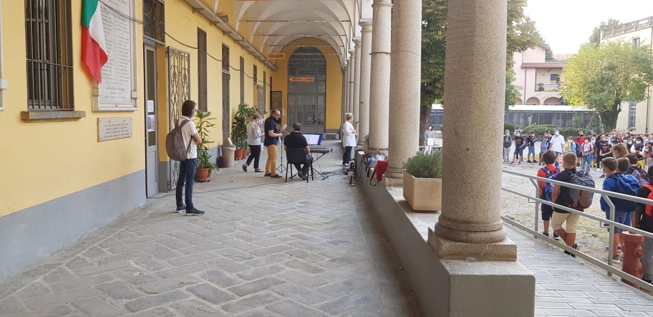 Per le classi prime, è avvenuto nel cortile interno della scuola, un breve momento di introduzione e presentazione ai nuovi arrivati del loro percorso scolastico, concluso con una piccola esibizione musicale del professore Pierantonio Merlini. A parlare ai ragazzi è stata l’assessore all’istruzione Franca Maggioni.