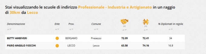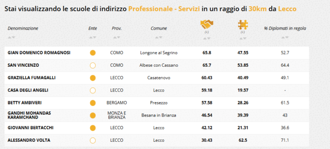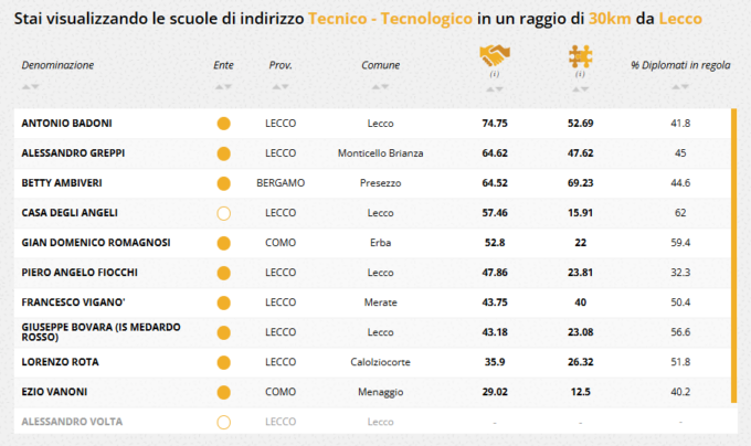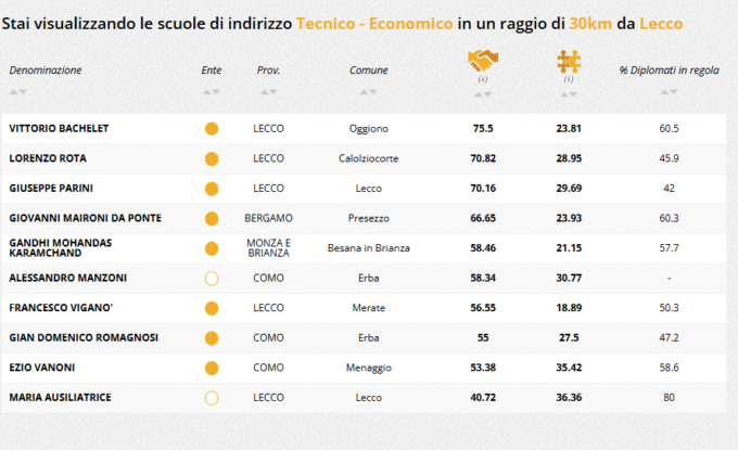 Due i parametri analizzati Eduscopio: da una parte la capacità di licei e istituti tecnici di preparare e orientare gli studenti agli studi universitari. Dall’altra l’attitudine di istituti tecnici e professionali a formare gli studenti per l’ingresso nel mondo del lavoro subito dopo il diploma. Per quanto riguarda i passaggio dalla scuola superiore l’analisi si suddivide in base all’area di studi (liceo scientifico, classico, istituto tecnico economico, ecc.,). Poi per scoprire i migliori istituti è necessario circoscrivere la ricerca all’area di residenza nel raggio di 10, 20 o 30 chilometri. Noi, come ogni anno per analizzare i risultati delle scuole lecchesi abbiamo scelto il raggio più ampio, partendo la Lecco, “sforando” quindi anche nel Monzese, nella Bergamasca e anche nel Comasco.