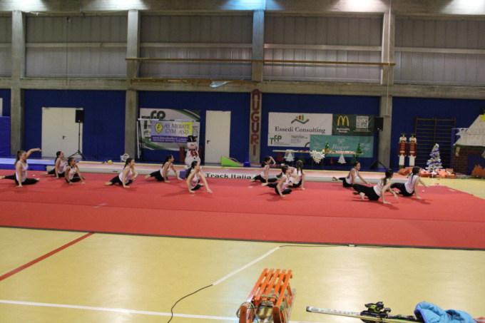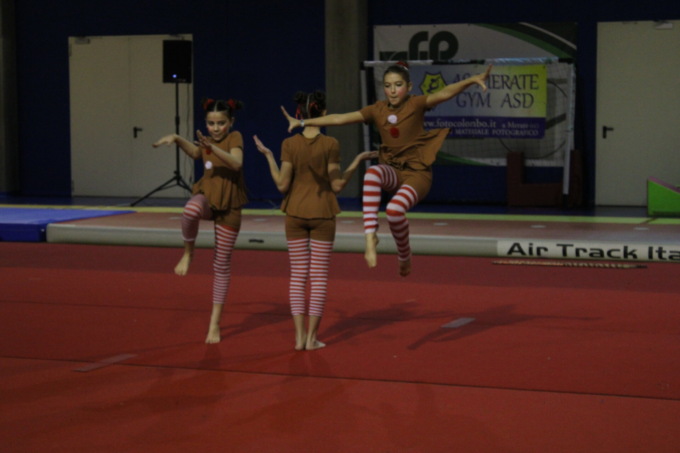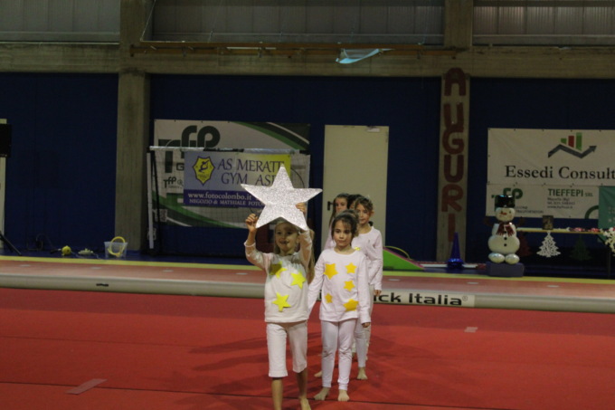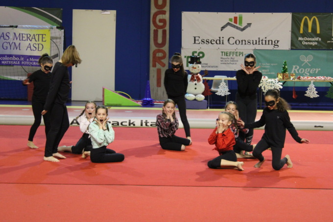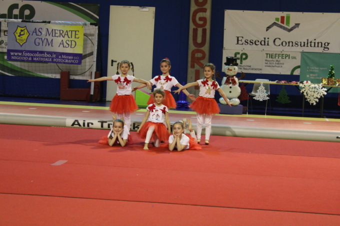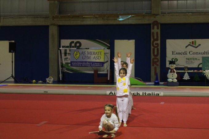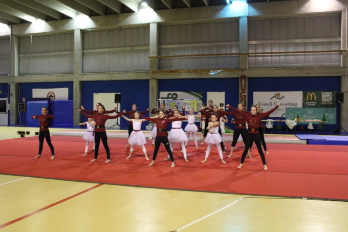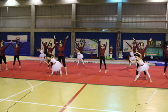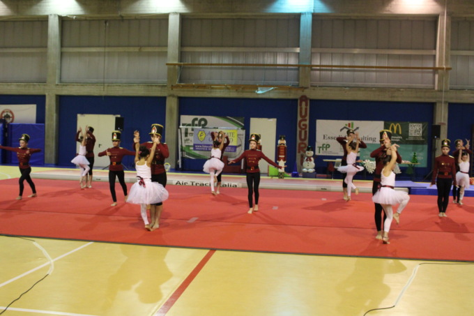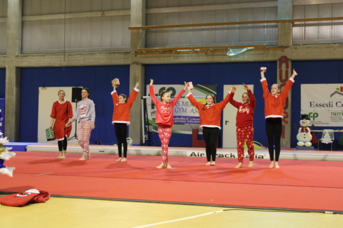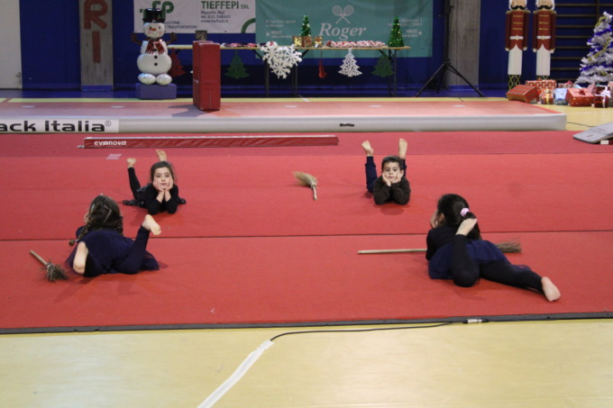 Ad aprire lo spettacolo sono stati i due gruppi baby gym seguiti dalle istruttrici Elena, Chiara, Alessandra e Sabrina che si sono esibiti personificando la Befana; il gruppo base invece di Martina, Simona e Greta ha rappresentato le renne e Babbo Natale; spazio poi al gruppo intermedio 1 con Alessandra e Claudia che hanno ricreato la magia delle stelle di Natale, il corso intermedio 2 di Emma, Claudia e Giulia invece ha rappresentato in pedana i fiocchi di neve. Immancabile la rappresentazione de Il Grinch con il gruppo medie insieme alle istruttrici Simona e Martina; il Ginger Red con il corso Start elementari seguito da Greta mentre il gruppo Esordienti di Mariaelena e Marta si è esibito portando in scena i simboli del Natale. Il gruppo Start medie Babbo Natale (seguito da Debora e Greta), il gruppo Avanzato agonistico 2 di Elena e Chiara alcune scene del film “Mamma ho perso l’aereo” e il gruppo Avanzato agonistico 1 di Debora e Greta la settimana bianca con tanto di sci e palle di neve.