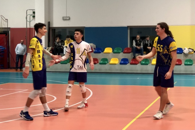 Nella sfida con Besana inizio molto equilibrato tra le due formazioni, con Besana che mostra una buona difesa così da poter rigiocare molti palloni. Si gioca punto a punto fino al 19 pari, poi allungo dei gialloblù in battuta e chiusura del set per 25-20. Si riparte per il secondo set e grazie a una maggiore efficacia in attacco dei gialloblù e un calo in difesa dei ragazzi di Besana il set si chiude per 25-13 a favore di Merate. Cambio campo e terzo set che riparte come si era chiuso il secondo: Merate prende subito buon margine che riesce a gestire fino alla fine (25-11) aggiudicandosi per 3-0 anche la seconda partita della giornata.