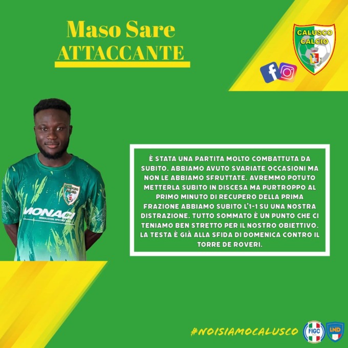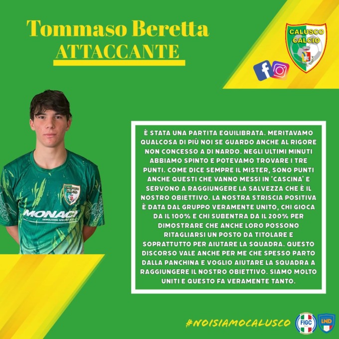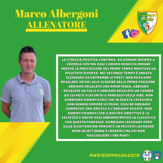 Al “Renzo Marzani” succede tutto nel primo tempo. La partenza è tutta per i biancoverdi che al 15’ vanno vicini al vantaggio con Roncalli, la conclusione è alta di poco. Un minuto più tardi e Magni K. da posizione piuttosto defilata disegna una parabola perfetta per Ruggeri che gira in porta di testa per l’1-0 Calusco. I locali spingono sfiorando il bis con Di Nardo alla mezzora ma Riboldi si salva. Una manciata di secondi prima dall’intervallo ecco il pari ospite: corner Vibe, la sfera attraversa tutta l’area piccola e Chiodo appostato sul secondo palo trafigge Luciano.