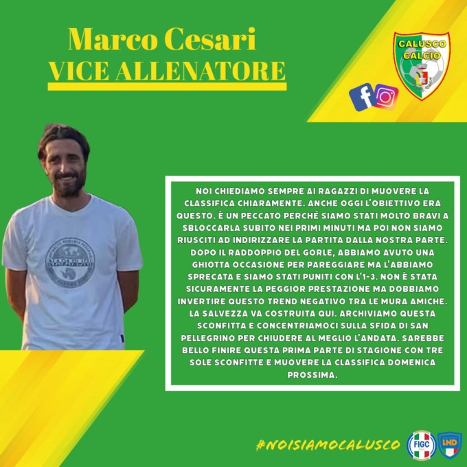 E pensare che la partita era iniziata con i migliori propositi, con la rete del vantaggio caluschese al 5’ grazie a Di Nardo, il quale aveva trafitto Erna con uno scavetto. Ma neanche passati dieci minuti che il Gorle perviene al pareggio con Birolini, lasciato un po’ solo nel colpire a rete. Gli ospiti completano la rimonta al 35’ con Dalzini, che ci prova dalla distanza e viene premiato grazie a un leggero rimbalzo che tradisce Luciano. Nella ripresa Calusco ci prova ma sbatte contro il montante di Lambiase, prima che Seferi chiuda l’incontro con un rasoterra angolato.