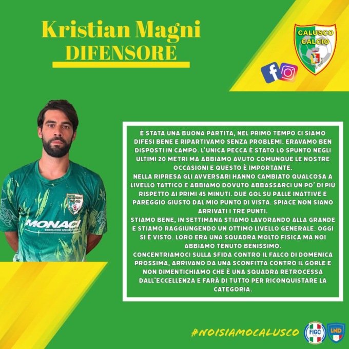 La gara vive di emozioni sin dalla prima frazione. Inizio propositivo del Calusco con Di Nardo che riceve il filtrata, converge verso l’area di rigore ma sul più bello scarica un rasoterra molle, cui fa presa facile Fasolini. Al 15′ occasione dei padroni di casa: Pesenti calcia la punizione e scarica un destro che viene allontanato da Magni K. Cinque minuti più tardi e i biancoverdi rispondono con la più nitida delle azioni: pallonetto pennellato di Longo che libera Di Nardo, il quale a sua volta controlla bene e si gira per calciare, il tiro tuttavia esce fuori.