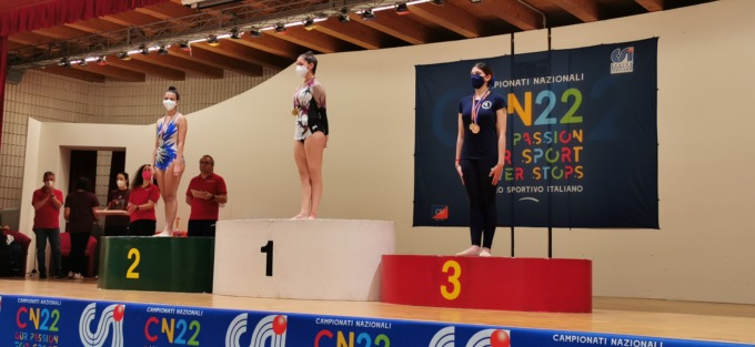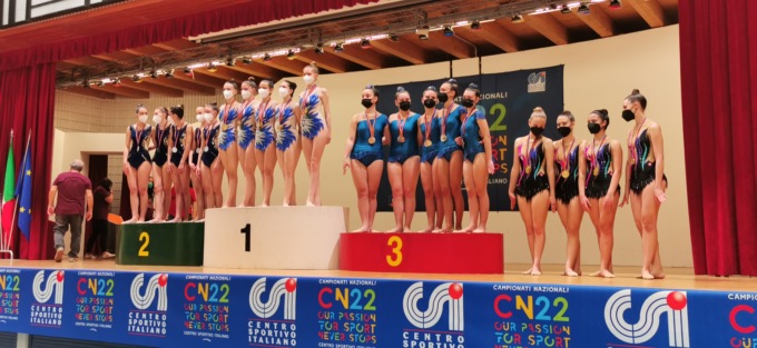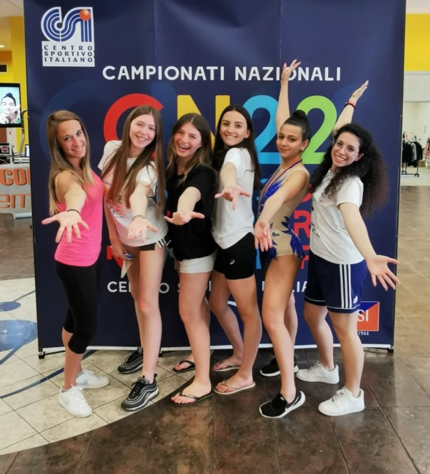 Gli ultimi due giorni, invece, hanno visto protagoniste le ragazze delle superiori che hanno partecipato a questo campionato con il programma completo di squadra. Emma, Giulia, Lucia, Margherita e Benedetta sono state le protagoniste dell’esercizio ai cerchi e nastri dove hanno ottenuto il titolo di campionesse nazionali di specialità. Sono scese in campo gara anche con un esercizio ai cinque nastri che però hanno terminato con diverse imperfezioni, conquistando così il terzo posto. La classifica assoluta di queste due esecuzioni le ha invece fatte salire sul secondo gradino del podio, ottenendo quindi una medaglia d’argento.
