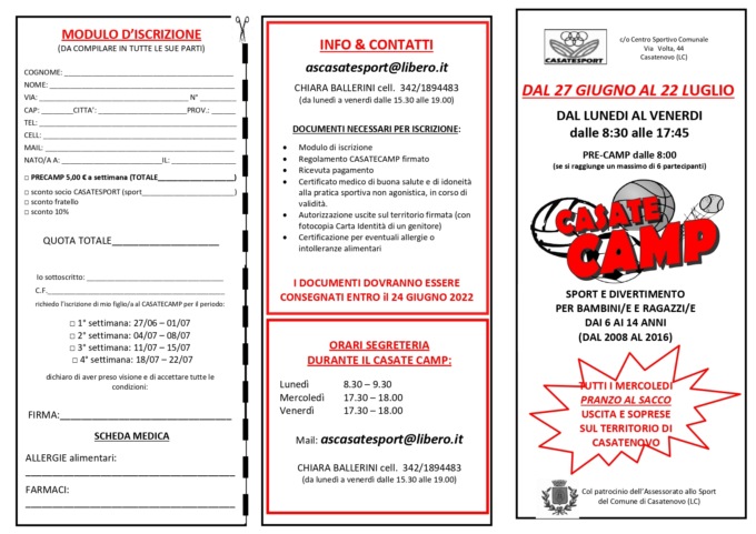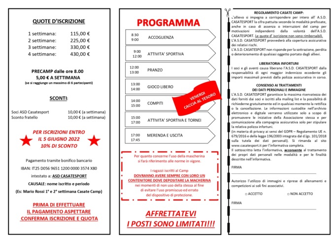 *previsto uno sconto di 10 euro a settimana per i soci Asd Casatesport e sconto fratello sempre di 10 euro a settimana