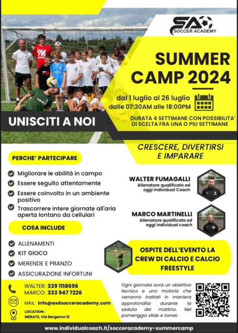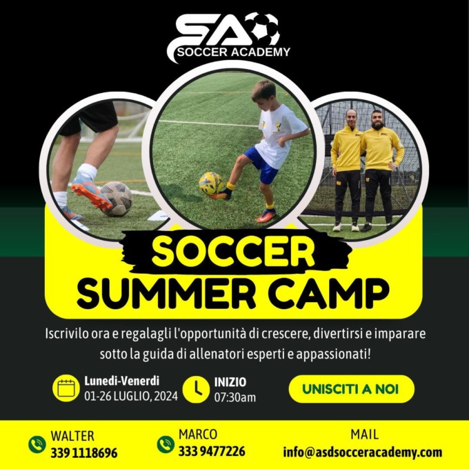 Crescere, giocare e divertirsi migliorando le proprie abilità in un campo da calcio: dai prossimi 1° al 26 luglio torna il Summer Camp targato Soccer Academy. Quattro settimane dedicate che si svolgeranno sui campi del Cavalier Ferrario a Merate.