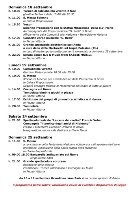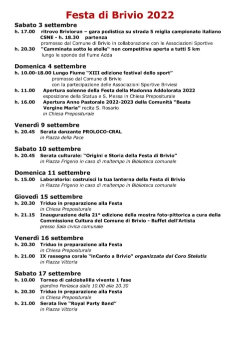 Eventi sportivi, culturali, ludici e tanti festeggiamenti in onore della Beata Vergine Addolorata, il tutto contornato da uno spettacolo pirotecnico che si preannuncia come “il migliore di tutti i tempi”. La Festa di Brivio inizierà sabato 3 settembre 2022 e terminerà domenica 25 settembre 2022: tante le iniziative e spettacoli di qualità che saranno offerti ai cittadini con il tanto atteso spettacolo pirotecnico, una serie di giochi per grandi e piccoli, una rappresentazione teatrale, il tutto senza dimenticare l’aspetto culturale dedicato alle origini e alla storia della manifestazione.