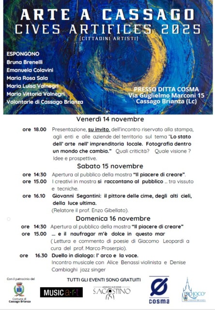 In arrivo un weekend dedicato alle manifestazioni d’arte Cives Artifices, nate per valorizzare le capacità artigiane dei cassaghesi. Gli eventi, dal 14 al 16 novembre 2025, si svolgeranno presso l’azienda Cosma a Cassago.