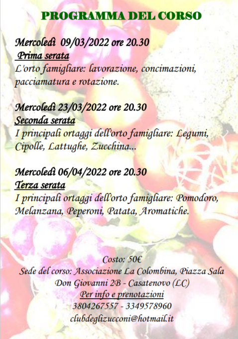 Il corso di orticoltura biologica organizzato dal Club degli Zucconi dell’associazione La Colombina di Casatenovo è tornato dopo più di due anni di fermo a causa della situazione pandemica. Le date delle serate sono mercoledì 9 marzo, 23 marzo e 6 aprile, tutte alle 20.30.