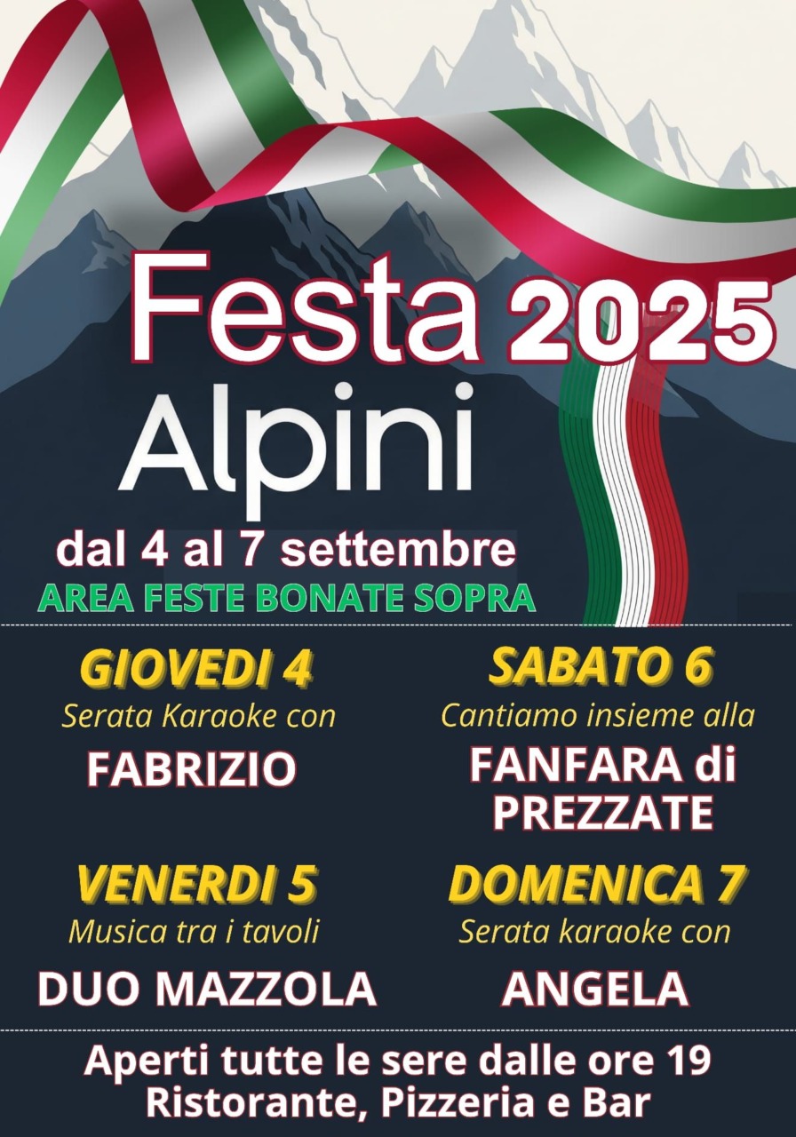 Festa Alpina del Gruppo Alpini di Bonate Sopra dal 4 al 7 settembre. Tutte le sere a partire dalle ore 19, sono aperti bar, ristorante e pizzeria. La sagra ogni sera sarà animata gruppi musicali.