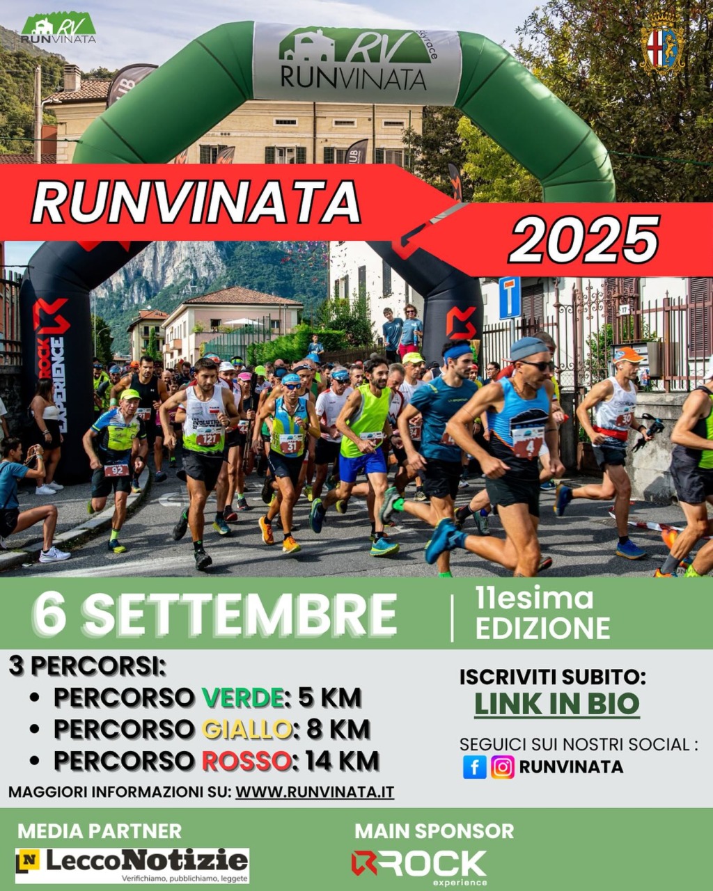 Sabato 6 settembre 2025, dall’oratorio del Caleotto, prenderà il via la Runvinata, tradizionale gara di corsa in montagna non competitiva organizzata nell’ambito dei festeggiamenti del Santuario della Madonna della Rovinata e patrocinata dal Comune di Lecco. La manifestazione propone percorsi di 5, 8 e 14 km, offrendo un’occasione per vivere lo sport e la montagna in modo sicuro e divertente.