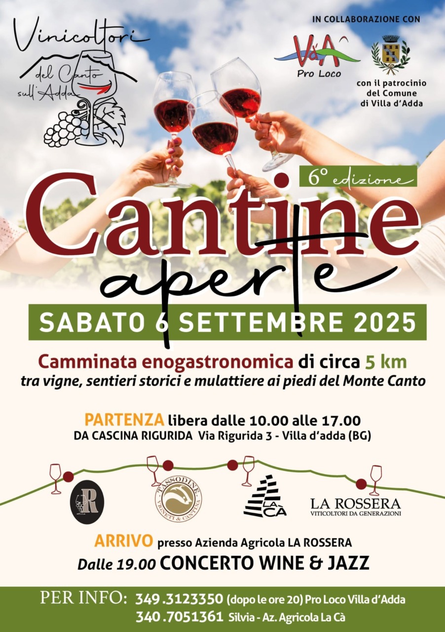 Sabato, 6 settembre, appuntamento con Cantine Aperte, camminata enogastronomica di circa 5 km tra vigne, sentieri storici e mulattiere ai piedi del Monte Canto. Partenza libera dalle 10 alle 17 da Cascina Rigurida (via Rigurida 3) a Villa dAdda, arrivo presso l’azienda agricola La Rossera. Dalle 19 concerto Wine & Jazz. Iscrizioni entro il 5 settembre (info: 340.7051361). Ticket 25 euro con degustazione di 2 vini, 15 euro degustazione analcolica.