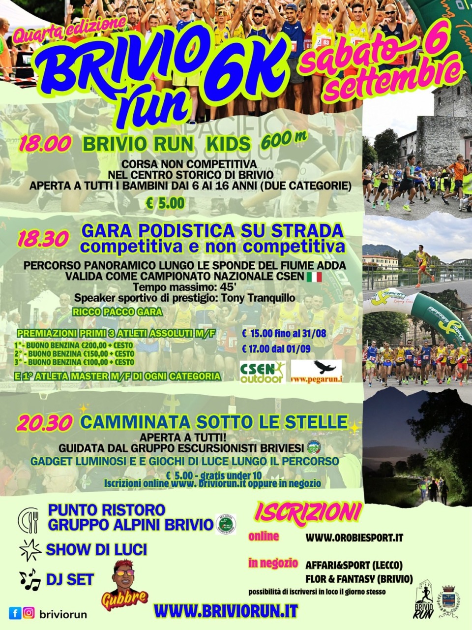 Partecipa alla spettacolare corsa lungo le sponde del Fiume Adda e nel centro storico di Brivio, in programma sabato, 6 settembre 2025. Scenari naturali e mozzafiato ti accompagneranno per 6km completamente su strada. La novità 2025 è che ci saranno 2 tipologie di gara, una competitiva con classifiche e premi finali e l’altra non competitiva priva di classifica ma con rilevamento del tempo impiegato. Ci sarà un’unica partenza. Altra novità sarà l’introduzione della gara “Kids”, non competitiva di 600 metri su strada e della camminata sotto le stelle serale aperta a tutti con giochi luminosi e musica.