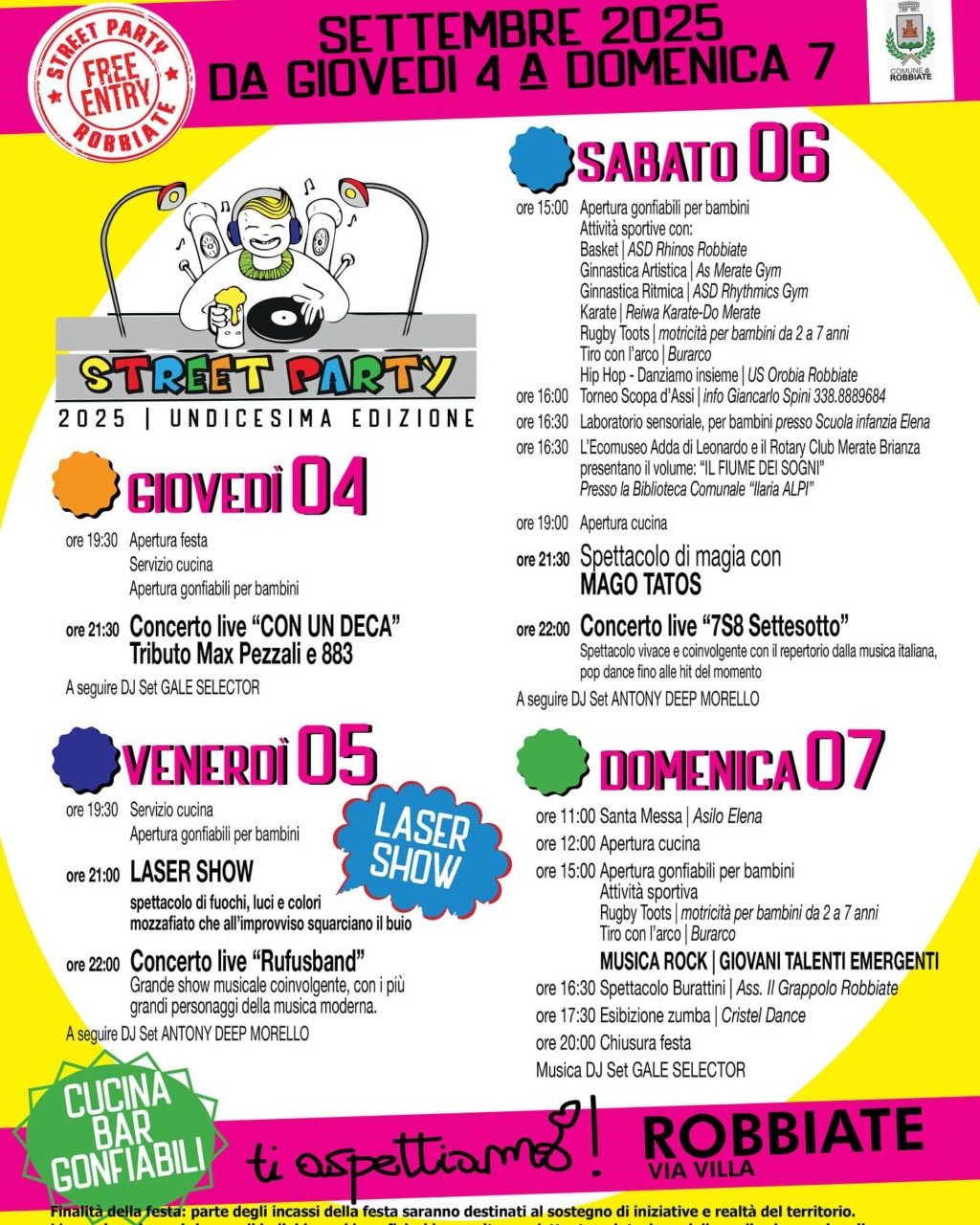 Sta per arrivare l undicesima edizione del Robbiate Street Fest, in programma da giovedì 4 a domenica 7 settembre con buon cibo, musica dal vivo, gonfiabili, laser show e anche uno spettacolo di magia. Venerdì il divertimento comincerà alle 19.30, mentre sabato si partirà alle 15, con tante attività sportive proposte delle associazioni del territorio. La giornata di domenica si aprirà alle 11 con una Messa, poi un pranzo in compagnia e tanto divertimento. Nei pomeriggio di sabato e domenica sarà anche possibile visitare palazzo Bassi Brugnatelli.