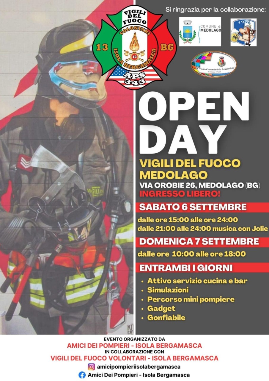 Sabato 6 settembre e domenica 7 settembre il distaccamento dei Vigili del Fuoco Volontari di Medolago (Via Orobie 26) organizza due giornate speciali ad ingresso libero. Sabato 6 settembre, dalle 21:00 musica live con Jolie e domenica 7 dalle 10:00 alle 18:00. In entrambe le giornate: Cucina e bar sempre attivi; Simulazioni ed esercitazioni; Percorso mini pompieri per i più piccoli e Gadget e gonfiabili. Un’occasione unica per conoscere da vicino il lavoro dei Vigili del Fuoco Volontari e passare momenti di divertimento in compagnia!