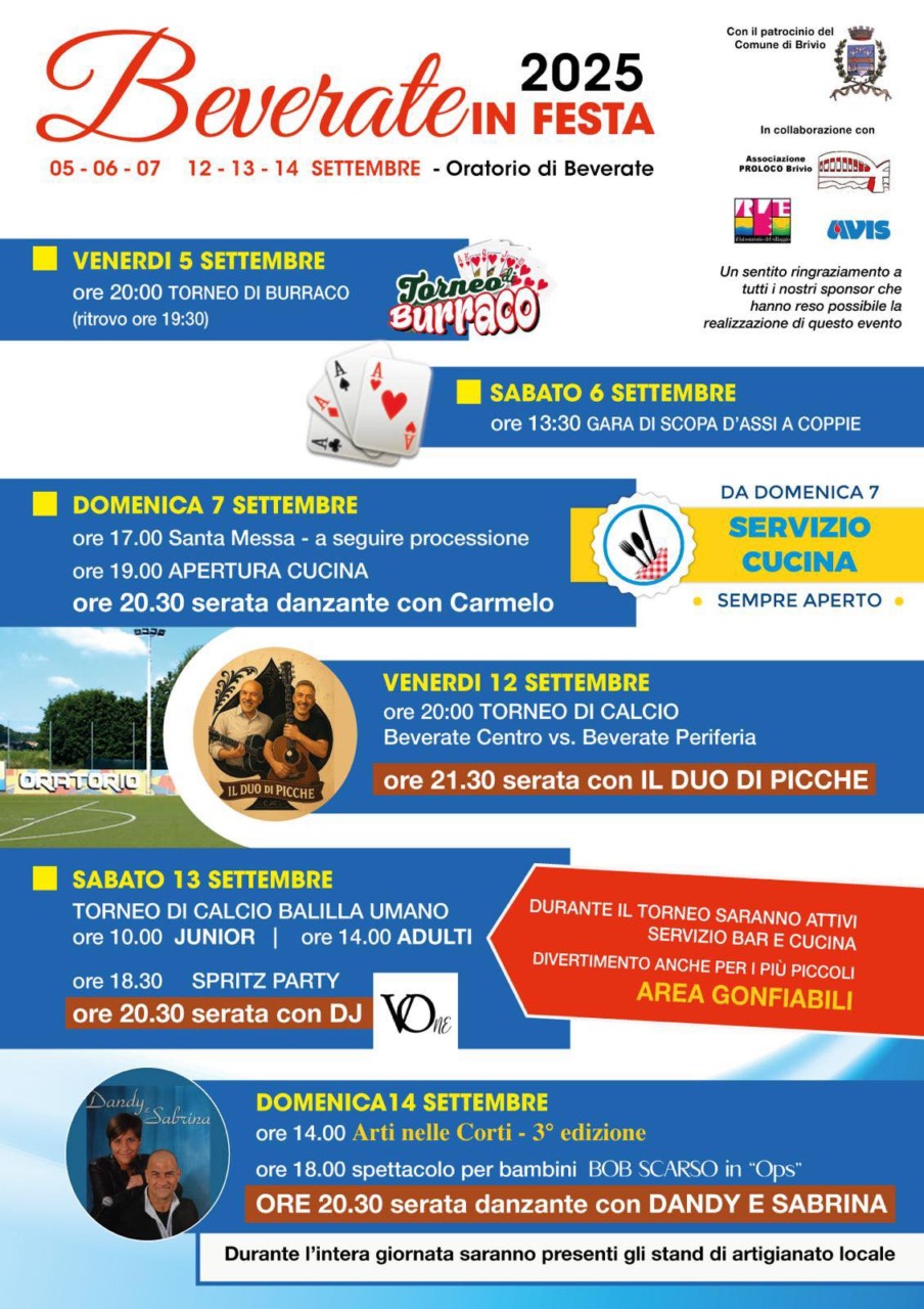 Venerdì 12 settembre alle 20 torneo di calcio con Beverate centro che sfiderà Beverate periferia e alle 21.30 serata con il Due di picche, sabato 13 torneo di calcio balilla umano (alle 10 junior, alle 14 adulti) con servizio bar e cucina e gonfiabili, alle 18 spritz party e alle 20.30 serata con dj. Domenica 14 alle 14 «Arti nelle corti – Terza edizione», alle 18 spettacolo per bambini, alle 20.30 serata danzante. Durante l intera giornata saranno presenti stand di artigianato locale.