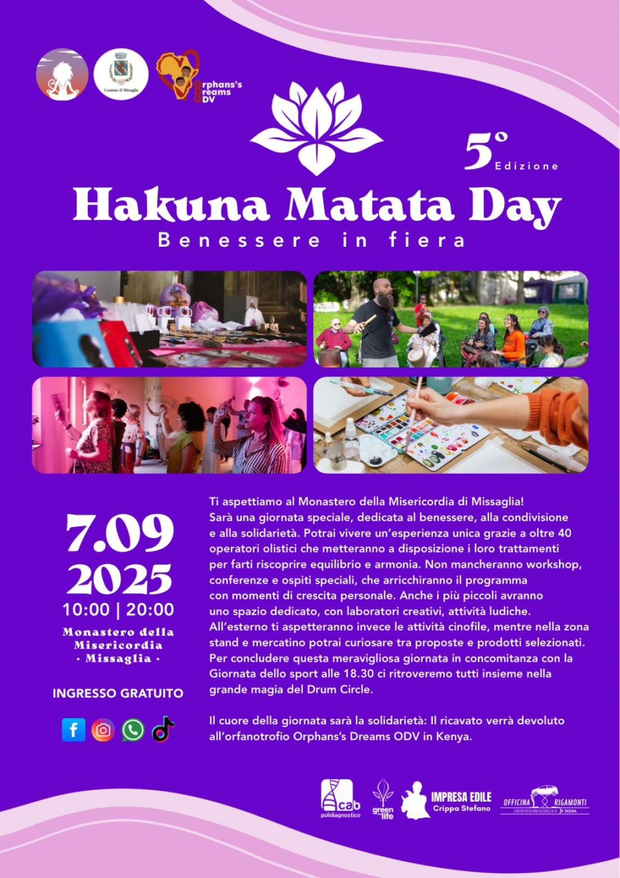 L’associazione olistica Centro Hakuna Matata, vi aspetta 𝗗𝗼𝗺𝗲𝗻𝗶𝗰𝗮 𝟳 𝗦𝗲𝘁𝘁𝗲𝗺𝗯𝗿𝗲 𝗱𝗮𝗹𝗹𝗲 𝟭𝟬.𝟬𝟬 𝗮𝗹𝗹𝗲 𝟮𝟬.𝟬𝟬 presso il Monastero della Misericordia. Sarà una giornata speciale, dedicata al benessere, alla condivisione e alla solidarietà. Potrai vivere un’esperienza unica grazie a oltre 40 operatori olistici che metteranno a disposizione i loro trattamenti per farti riscoprire equilibrio e armonia. Non mancheranno workshop, conferenze e ospiti speciali, che arricchiranno il programma con momenti di crescita personale. Anche i più piccoli avranno uno spazio dedicato, con laboratori creativi, attività ludiche.