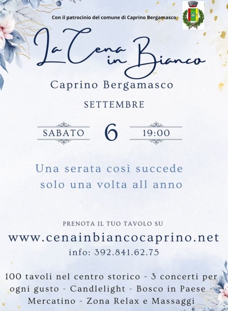 Un grande evento è in arrivo questo weekend a Caprino Bergamasco: sabato 6 settembre 2025 torna infatti, per la sua seconda edizione, la Cena in bianco. Una serata magica in cui tutto il paese si tingerà di un candido colore per passare dei magici e rilassanti momenti tutti insieme.