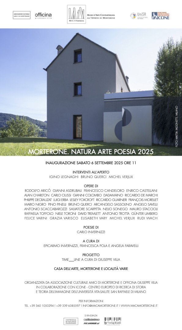 L’Associazione Culturale Amici di Morterone e Officina Giuseppe Villa, in collaborazione con Icone – Centro Europeo di Ricerca di Storia e Teoria dell’Immagine dell’Università Vita-Salute San Raffaele di Milano, inaugurano sabato 6 settembre 2025 alle ore 11 la mostra Morterone. Natura Arte Poesia 2025.