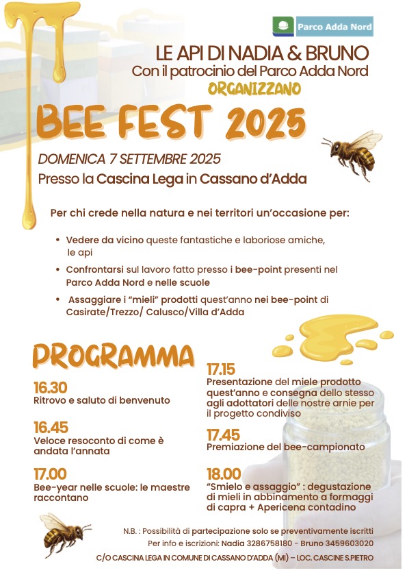 Domenica 7 Settembre a Cassano d’Adda presso Cascina Lega, col patrocinio del Parco Adda Nord, è in programma “Bee Fest 2025”, un intero pomeriggio dedicato alle api con la presentazione del miele prodotto quest’anno e una degustazione con formaggi di capra e apericena contadina.