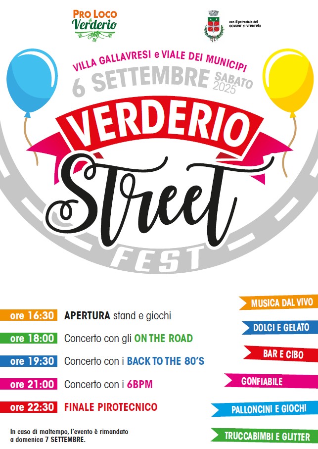 Villa Gallavresi e viale dei Municipi stanno per animarsi e ospitare stand, giochi, musica e tanto divertimento. Pro Loco, con il patrocinio del Comune, sta organizzando infatti il «Verderio Street Fest» in programma per sabato 6 settembre. Apertura stand e giochi alle 16.30, alle 18 concerto con gli On the road, alle 19.30 sul palco ci saranno i Back to the 80 s e alle 21 i 6Bpm. Finale di serata alle 22.30 con uno spettacolo pirotecnico.