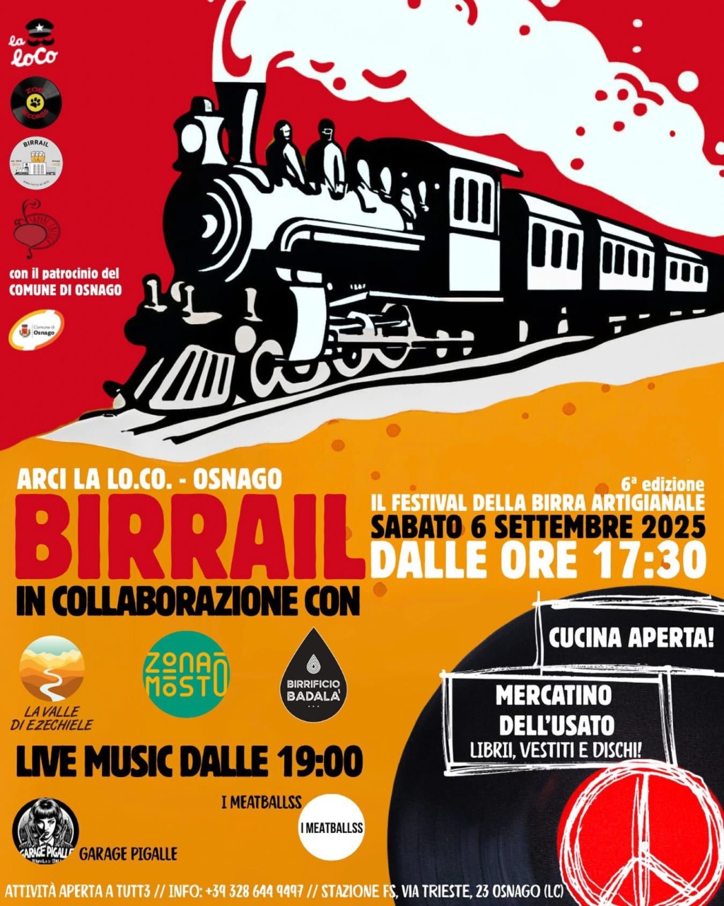 La Lo.Co. riapre i battenti con un inizio stagione scoppiettante. Tutto pronto per la sesta edizione del festival della birra artigianale “Birrail”. Appuntamento sabato 6 settembre 2025 dalle 17.30 alla sede di Arci La Lo.Co in via Trieste, 23 – Osnago. Dalle 19 inizierà il concerto live e aprirà la cucina del Circolo. Alla cassa sarà possibile acquistare i gettoni, con i quali si potrà bere le birre agli stand dei tre birrifici. Il costo di 1 gettone è di 2,50 euro. Birrail è un evento all’insegna della sostenibilità: vanta la partnership di “Amico Bicchiere”, che fornirà bicchieri riutilizzabili e 100% riciclabili. Per ogni bicchiere ci sarà una cauzione di 2 euro.