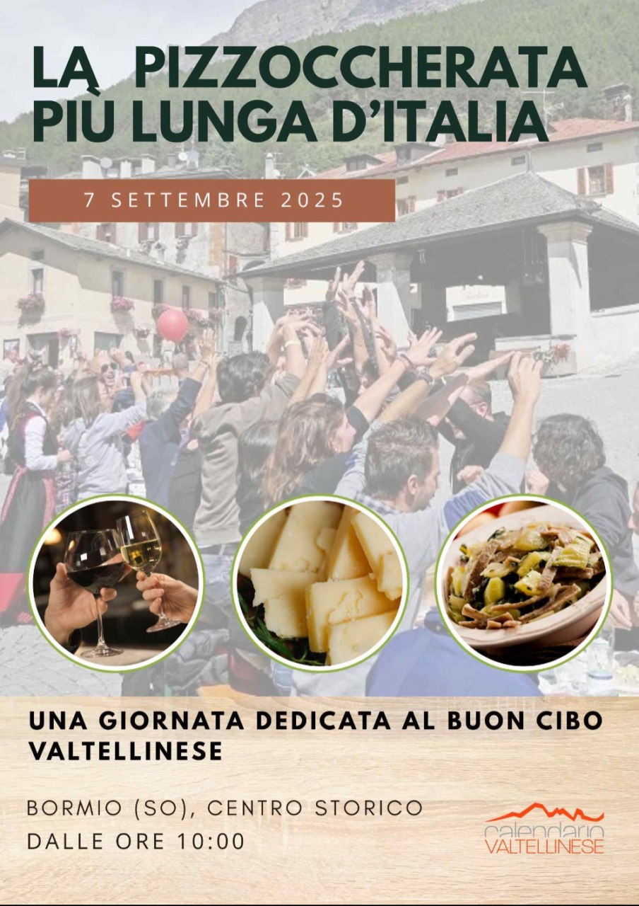 Domenica 7 settembre 2025, il centro storico di Bormio, da piazzetta S. Vitale lungo via Roma, fino a piazza del Kuerc, ospita uno degli eventi enogastronomici di punta dell’estate in Valtellina: la pizzoccherata più lunga d’Italia. Un’unica tavolata di 800 metri con 2026 commensali pronti a gustare gli ottimi pizzoccheri preparati a mano da 16 ristoranti del comprensorio. Sarà una domenica dedicata al buon cibo con tante degustazioni di prodotti e vini locali e un’occasione imperdibile per stare in compagnia mangiando, ridendo e divertendosi! E poi musica tipica, balli e l’immancabile intrattenimento musicale con i “Coscritti in Premana”, i suonatori di campanacci della Val Monastero e, a seguire nel pomeriggio, musica dal vivo e animazione.
