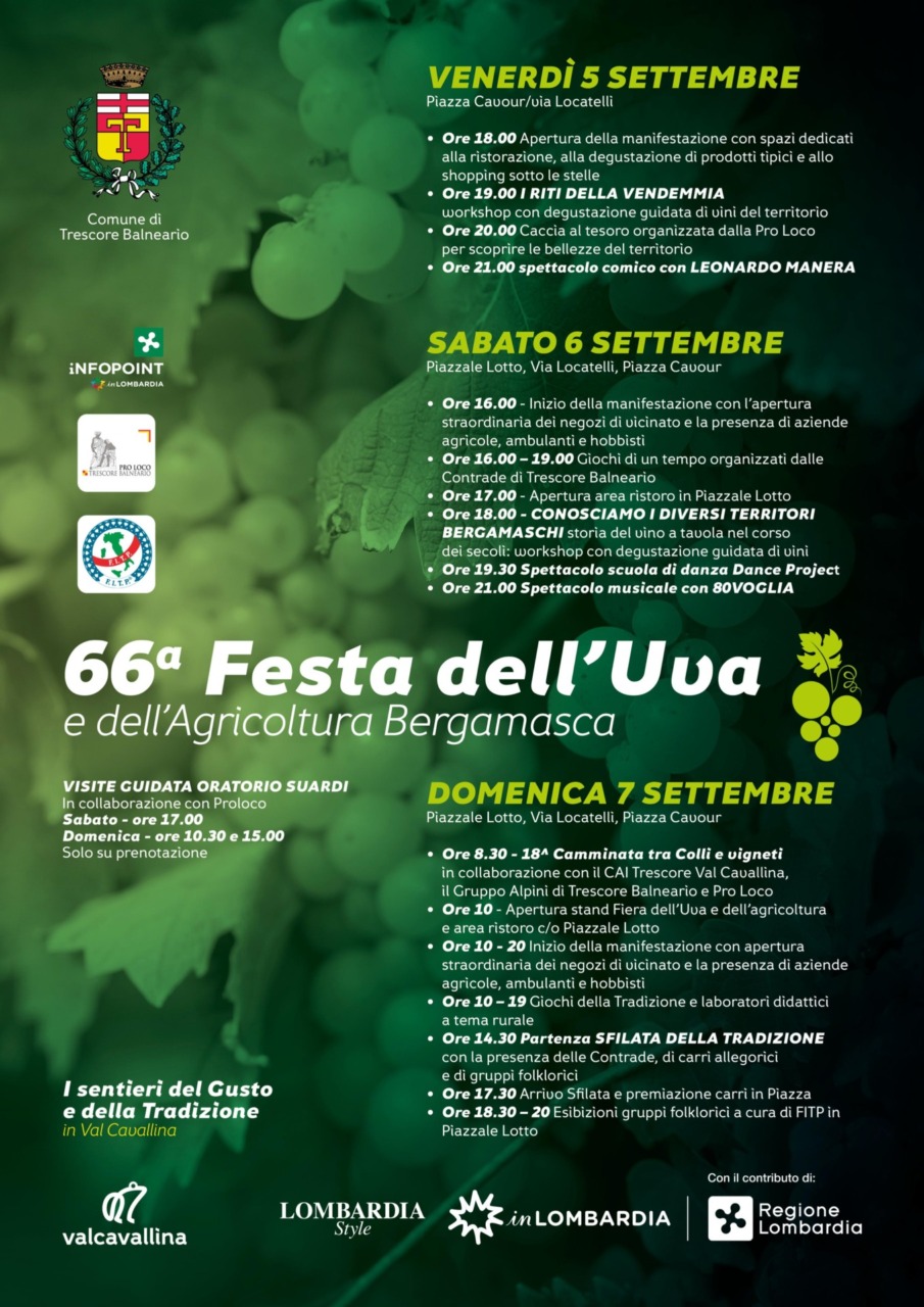 Il Comune di Trescore Balneario in collaborazione con il Distretto del Commercio delle Torri presenta la 66^ Festa dell’Uva e dell’Agricoltura: manifestazione storica che da decenni celebra il legame profondo tra la comunità e le sue radici rurali. L’evento si apre venerdì 5 settembre in Piazza Cavour, dove prenderanno vita i primi momenti conviviali. Il pubblico potrà partecipare a una degustazione guidata di vini del territorio, accompagnata da un viaggio nei “riti della vendemmia” che intreccia racconti di vita e gusto. La serata sarà accompagnata da musica dal vivo e dalle proposte gastronomiche dei commercianti e delle aziende agricole locali con prodotti tipici.