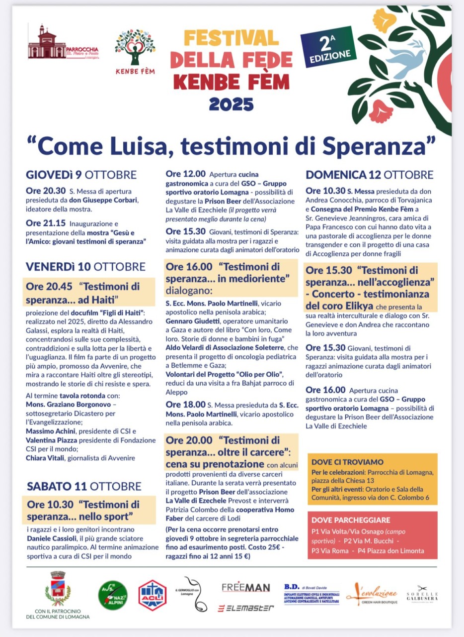 «Come Luisa, testimoni di Speranza». Questo il tema della seconda edizione del festival Kembe Fèm, che si terrà dal 9 al 12 ottobre 2025 a Lomagna in memoria di piccola sorella Luisa Dell’Orto, uccisa nel giugno 2022 ad Haiti dove da anni si trovava come missionaria a Kay Chal.