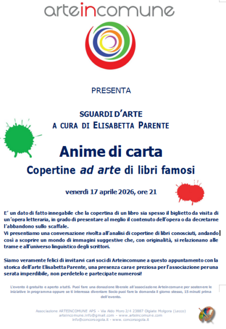 “E’ un dato di fatto innegabile che la copertina di un libro sia spesso il biglietto da visita di un’opera letteraria, in grado di presentare al meglio il contenuto dell’opera o da decretarne l’abbandono sullo scaffale – si legge nel volantino diffuso da Arteincomune – Vi presentiamo una conversazione rivolta all’analisi di copertine di libri conosciuti, andando così a scoprire un mondo di immagini suggestive che, con originalità, si relazionano alle trame e all’universo linguistico degli scrittori”.